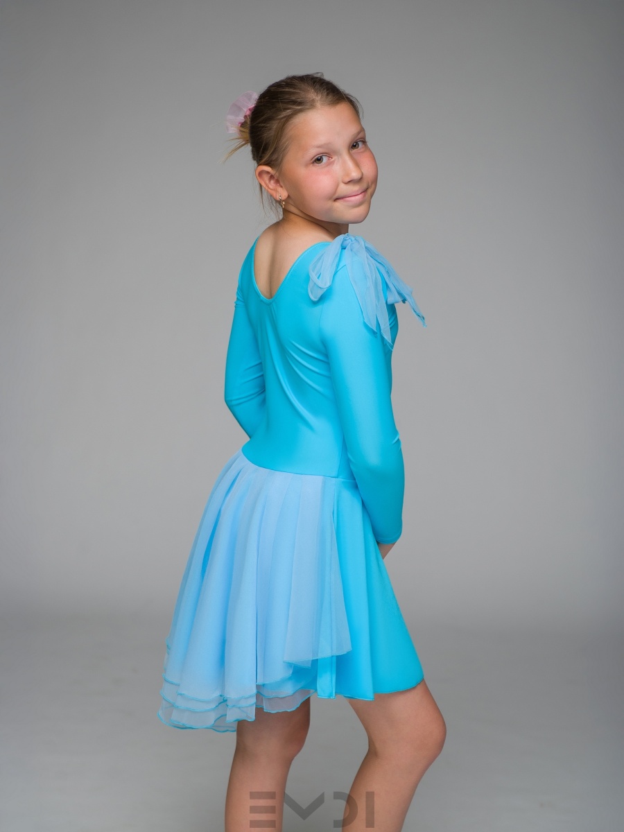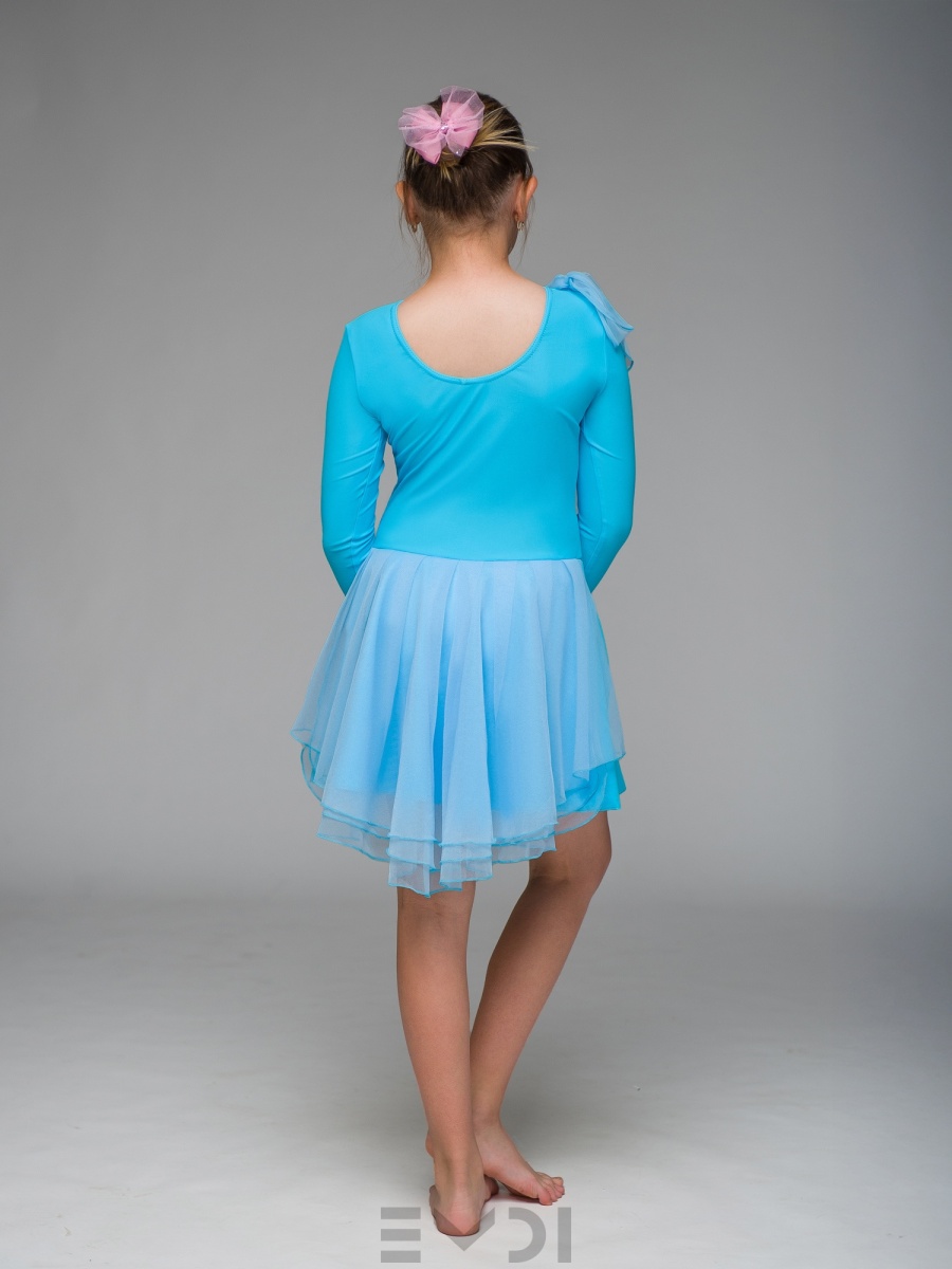 Комбидресс для занятий бальными танцами и хореографией. Вшитая юбка на спине собрана в широкую складку, драпированная органзой и стильно удлинена. Декоративный бант на плече несъемный.