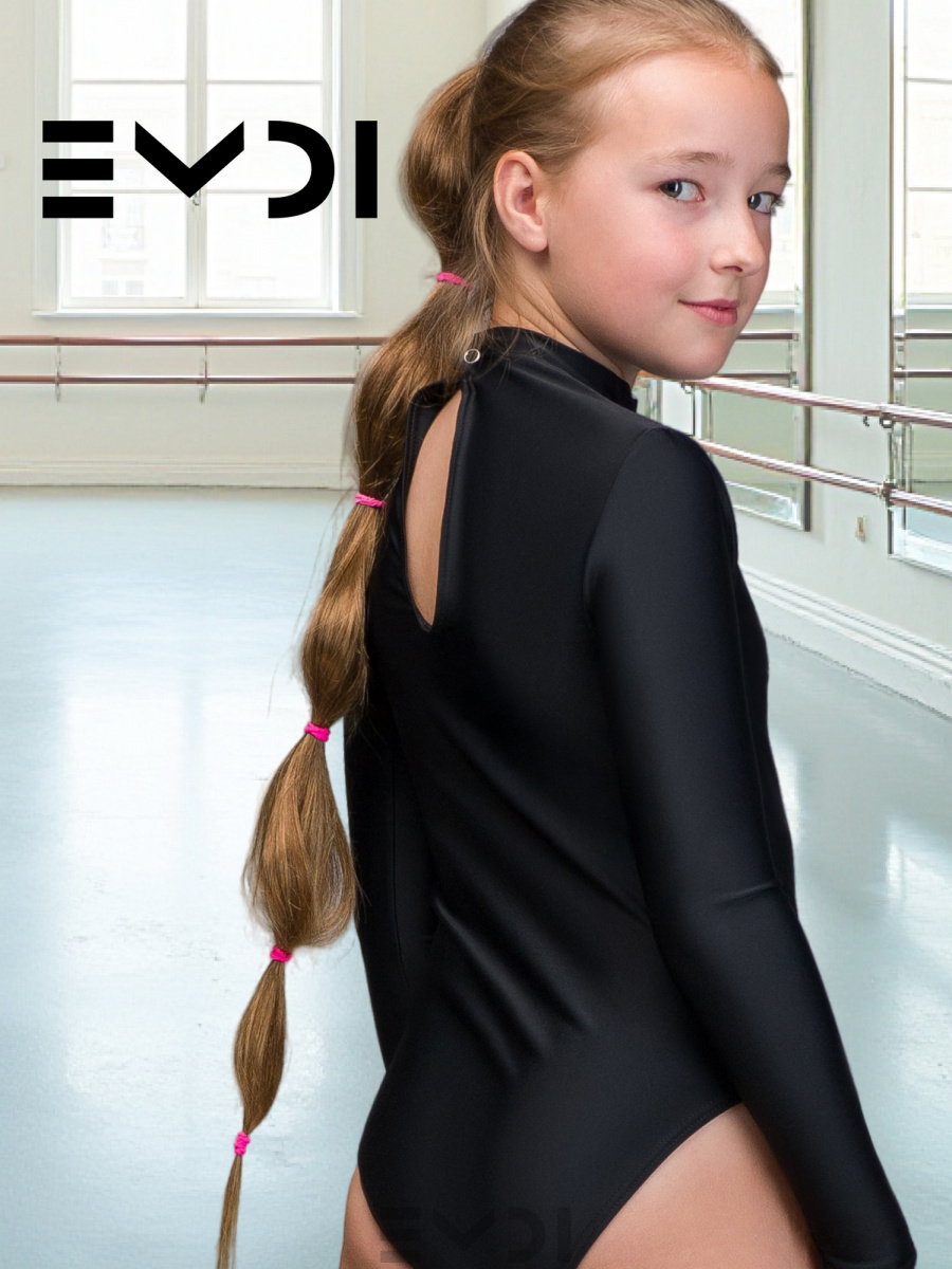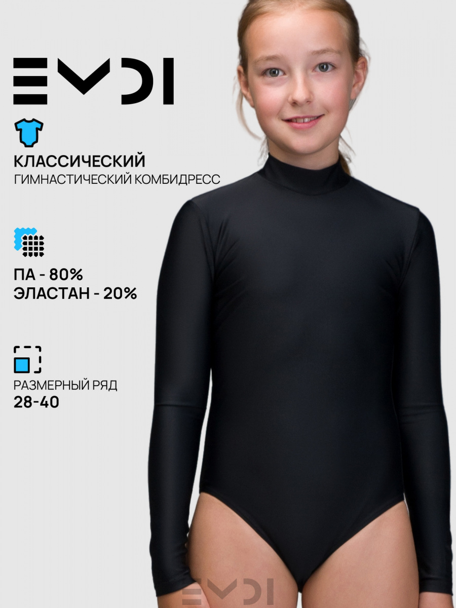 Классический гимнастический комбидресс с закрытым воротничком-стойка. Длина рукава соответствуют требованиям гимнастических школ.