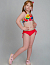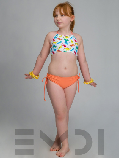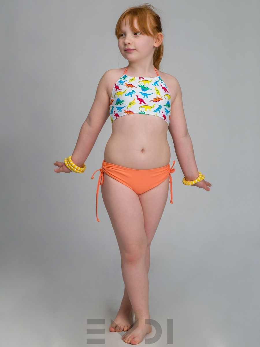 Яркий и озорной купальник для девочки. Принтованный лиф и однотонные плавки со сборкой по бокам. Завязка на шее. Дублированные передние детали лифа и плавок. УФ фильтр. Материал быстросохнущий и гипоаллергенный.