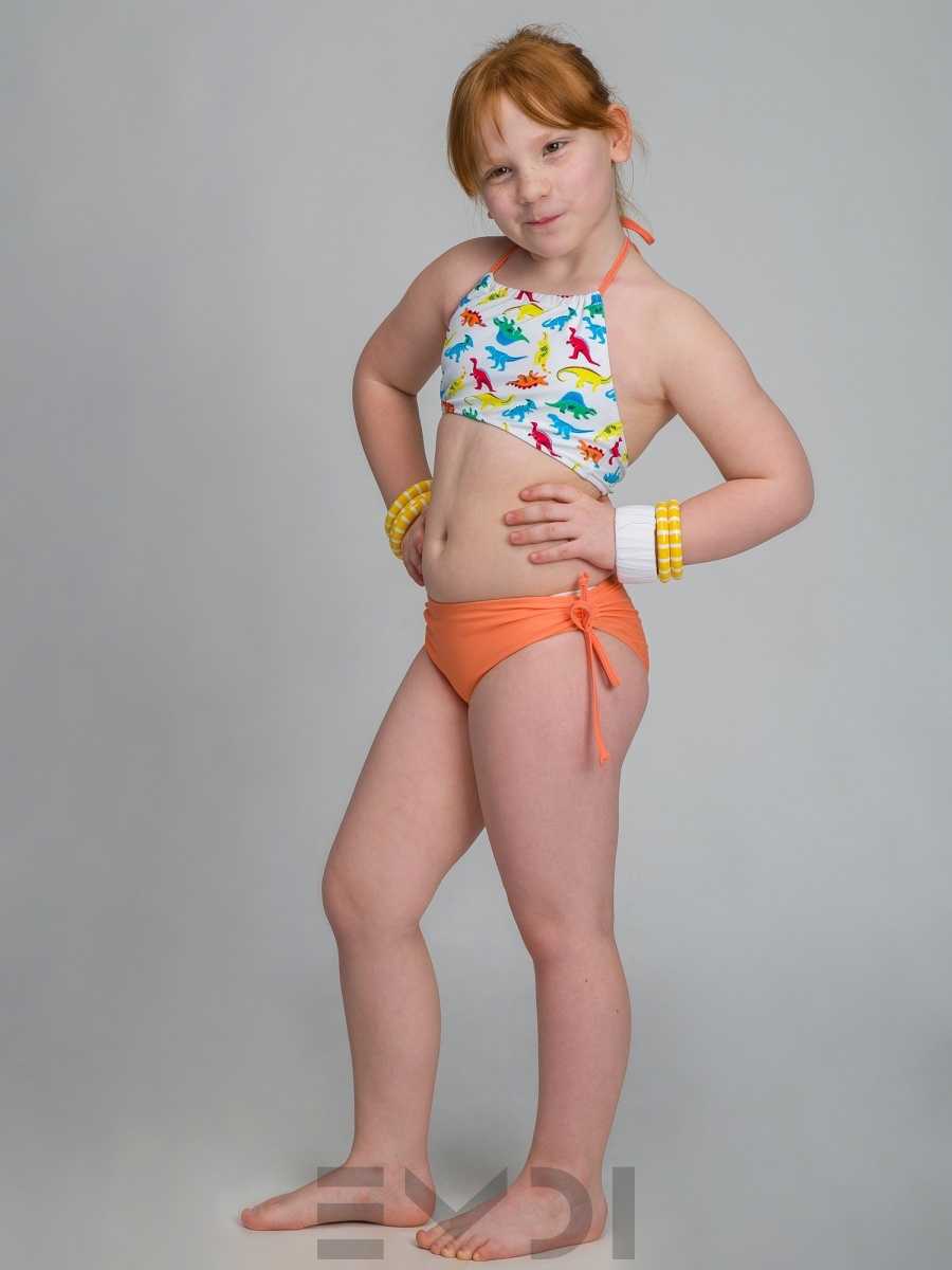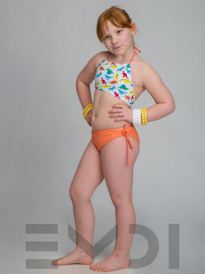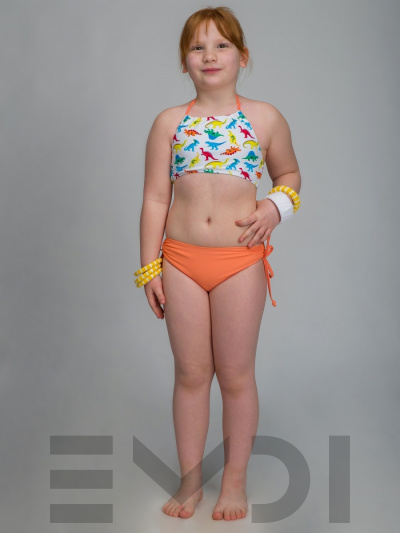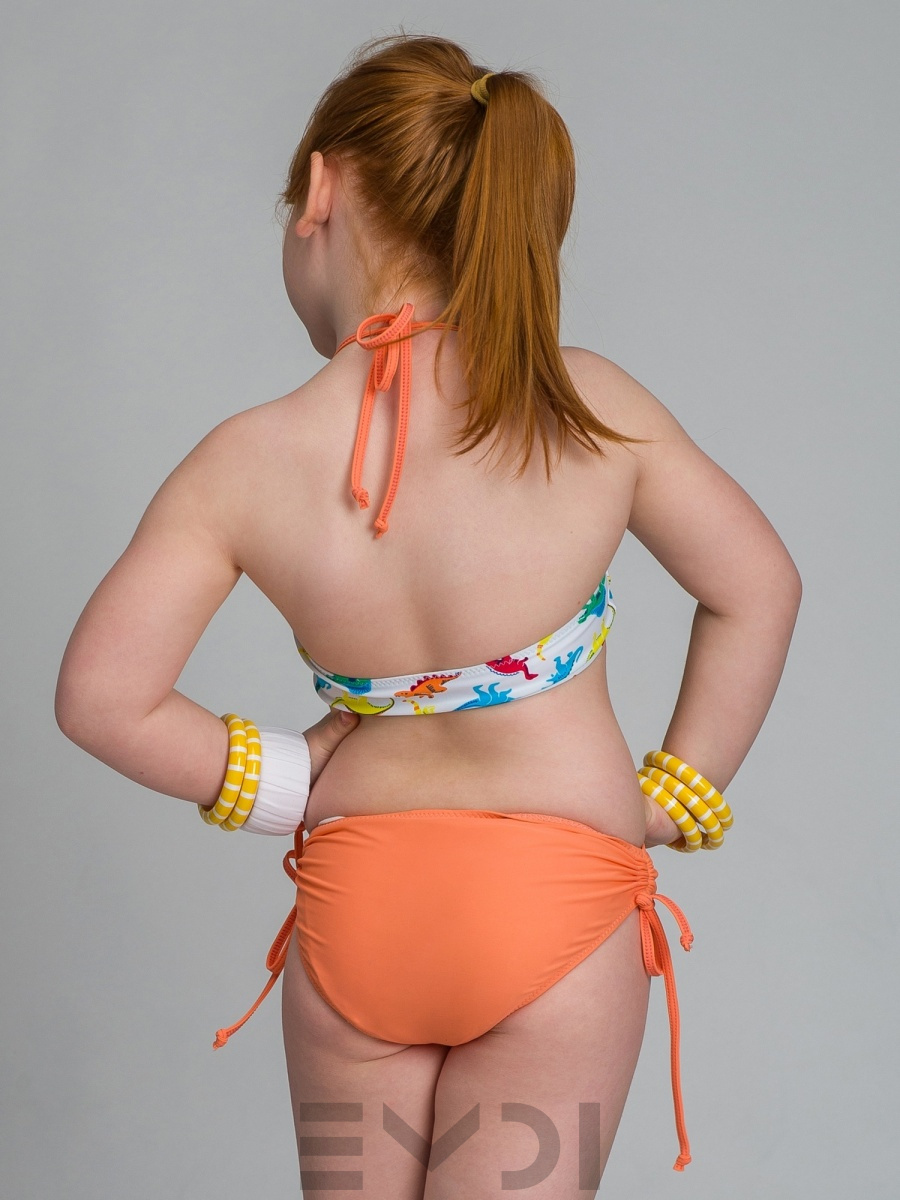 Яркий и озорной купальник для девочки. Принтованный лиф и однотонные плавки со сборкой по бокам. Завязка на шее. Дублированные передние детали лифа и плавок. УФ фильтр. Материал быстросохнущий и гипоаллергенный.