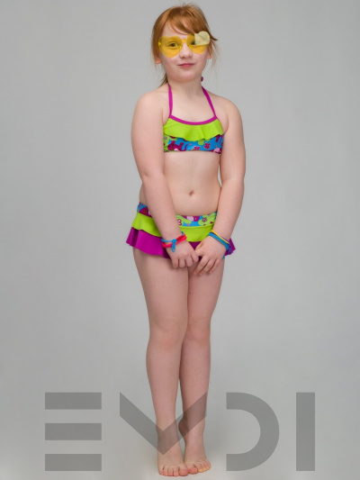 Оригинальный пляжный купальник для маленькой модницы. Выполнен из яркого принта и украшен контрастными рюшами.