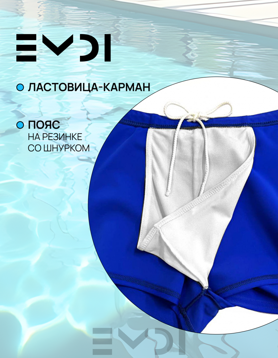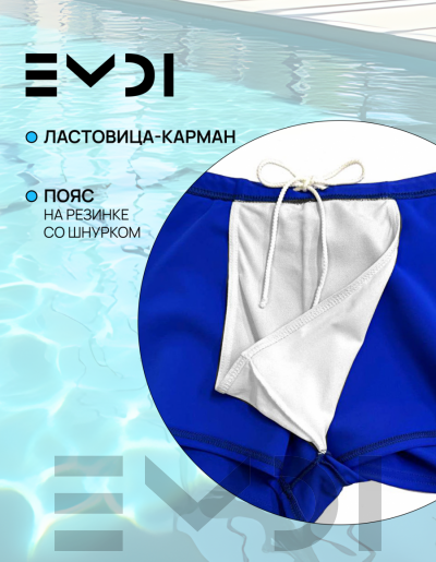 Классические однотонные плавки-шорты. Пояс на резине со шнуром. Ластовица-карман. Материал устойчив к хлорированной и морской воде.