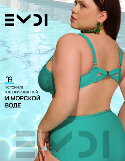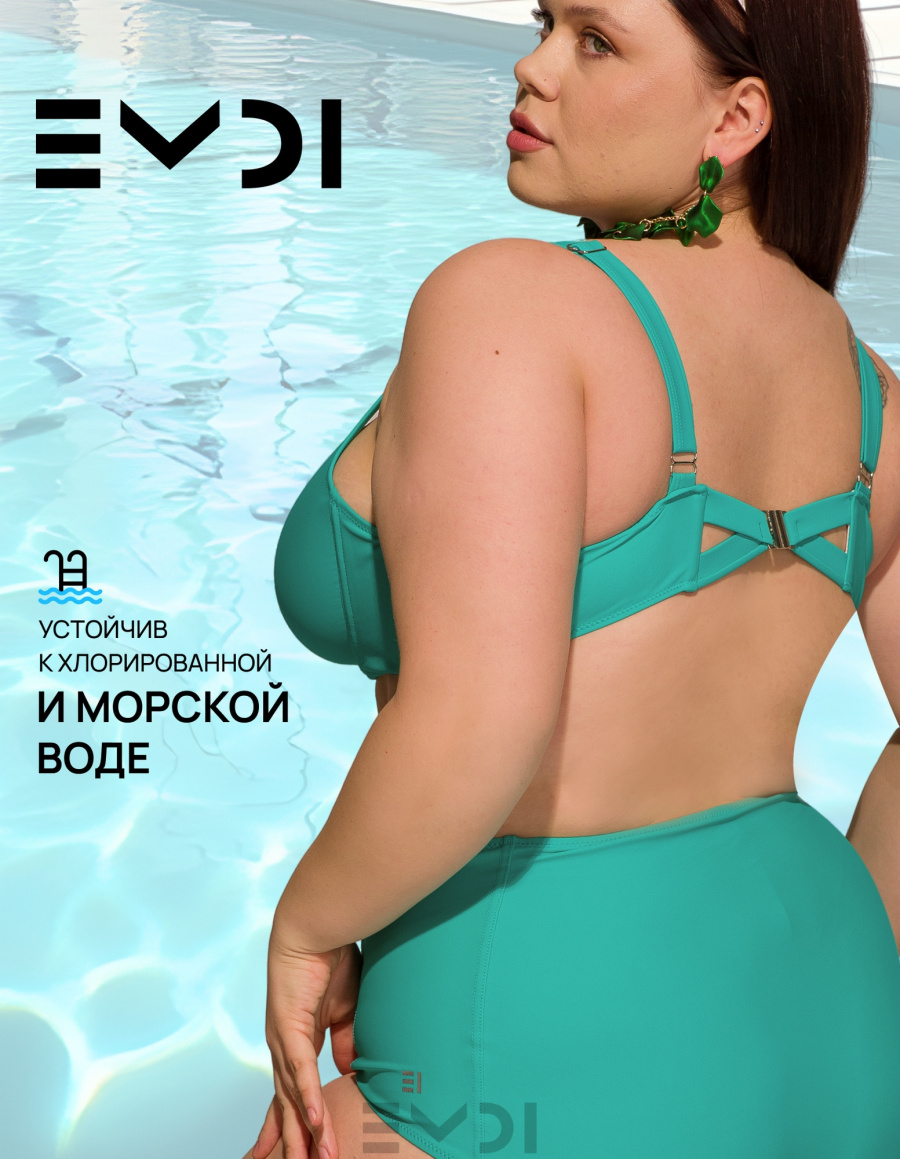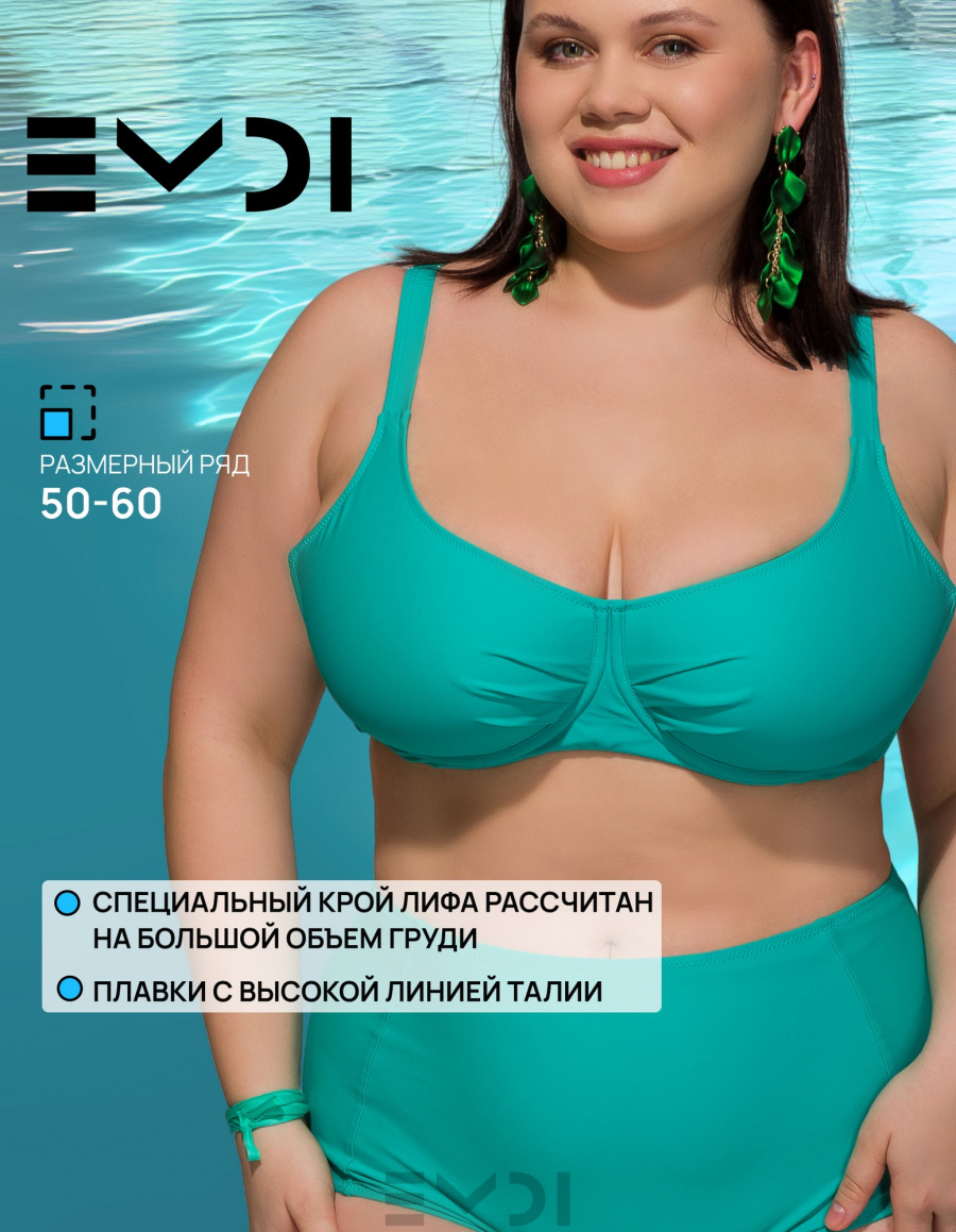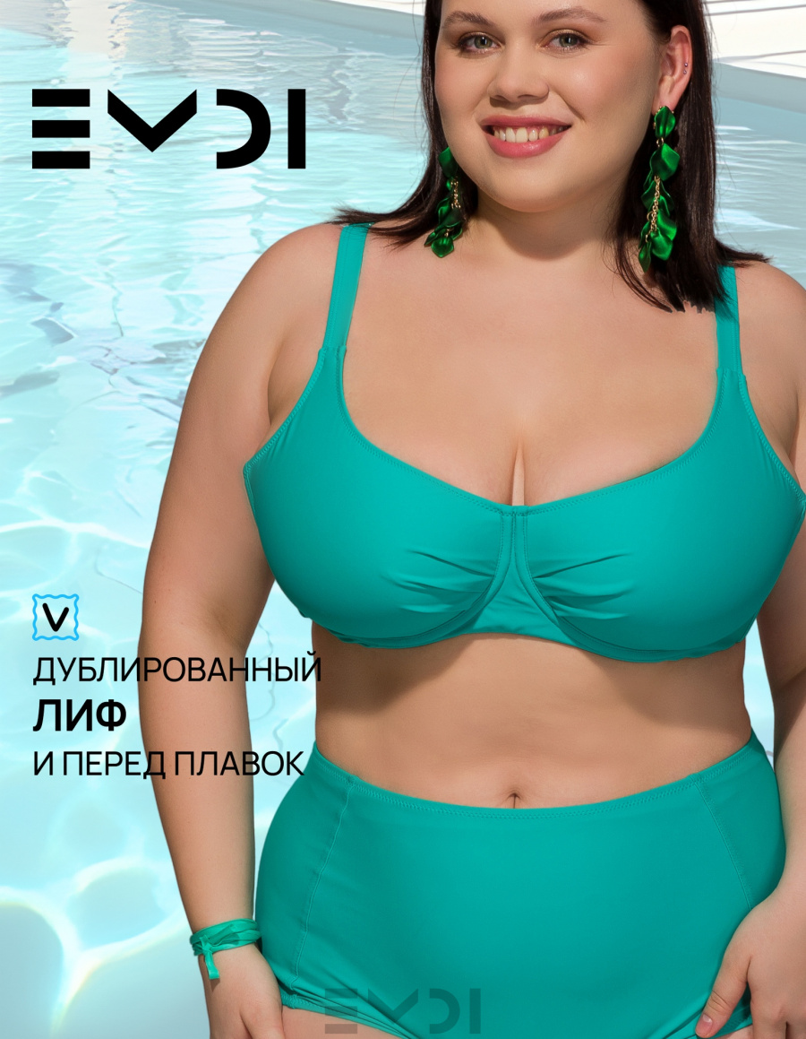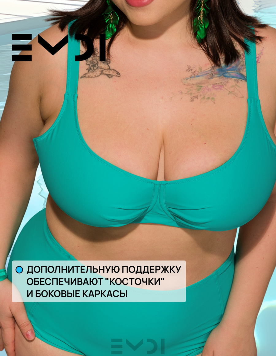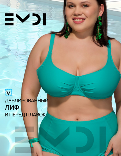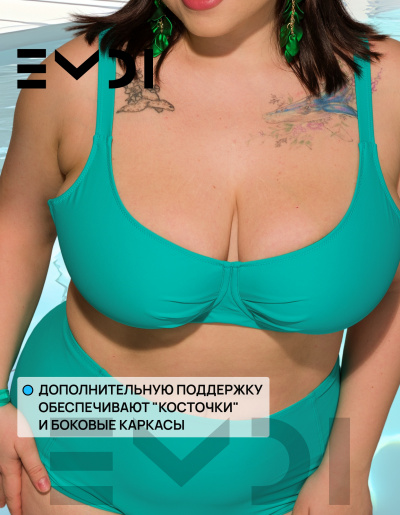 Классический раздельный купальный костюм в спортивном стиле. Специальный крой лифа рассчитан на большой объем груди. Дополнительную поддержку обеспечивают "косточки" и боковые каркасы. Бретели регулируются по высоте. Металлическая застежка на спине.Дублированные лиф и перед плавок. Материал устойчив к морской и хлорированной воде. Плавки с высокой линией талии. Состав:полиамид 80% - эластан 20%