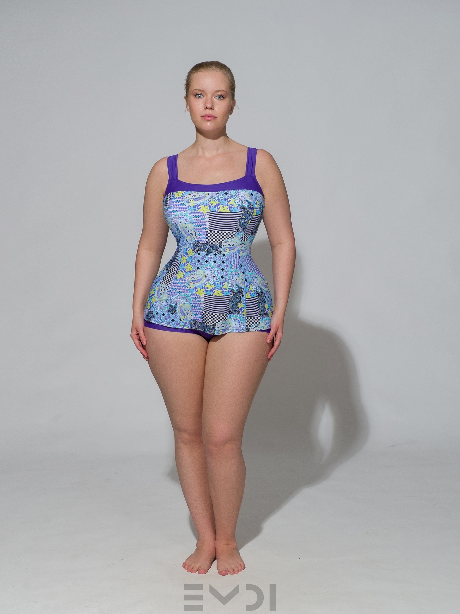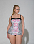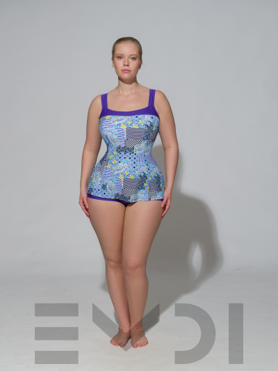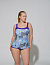 Изысканный сплошной купальник для женщин. Модель с мягкими формованными чашками и с резиной под грудью. Передняя деталь выполнена из принтованного полотна и слегка удлинена так, что создается эффект платья. Сзади купальник выполнен из однотонного полотна, имеет глубокий вырез на спине и низкую линию бедра. Материал устойчив к морской и хлорированной воде.