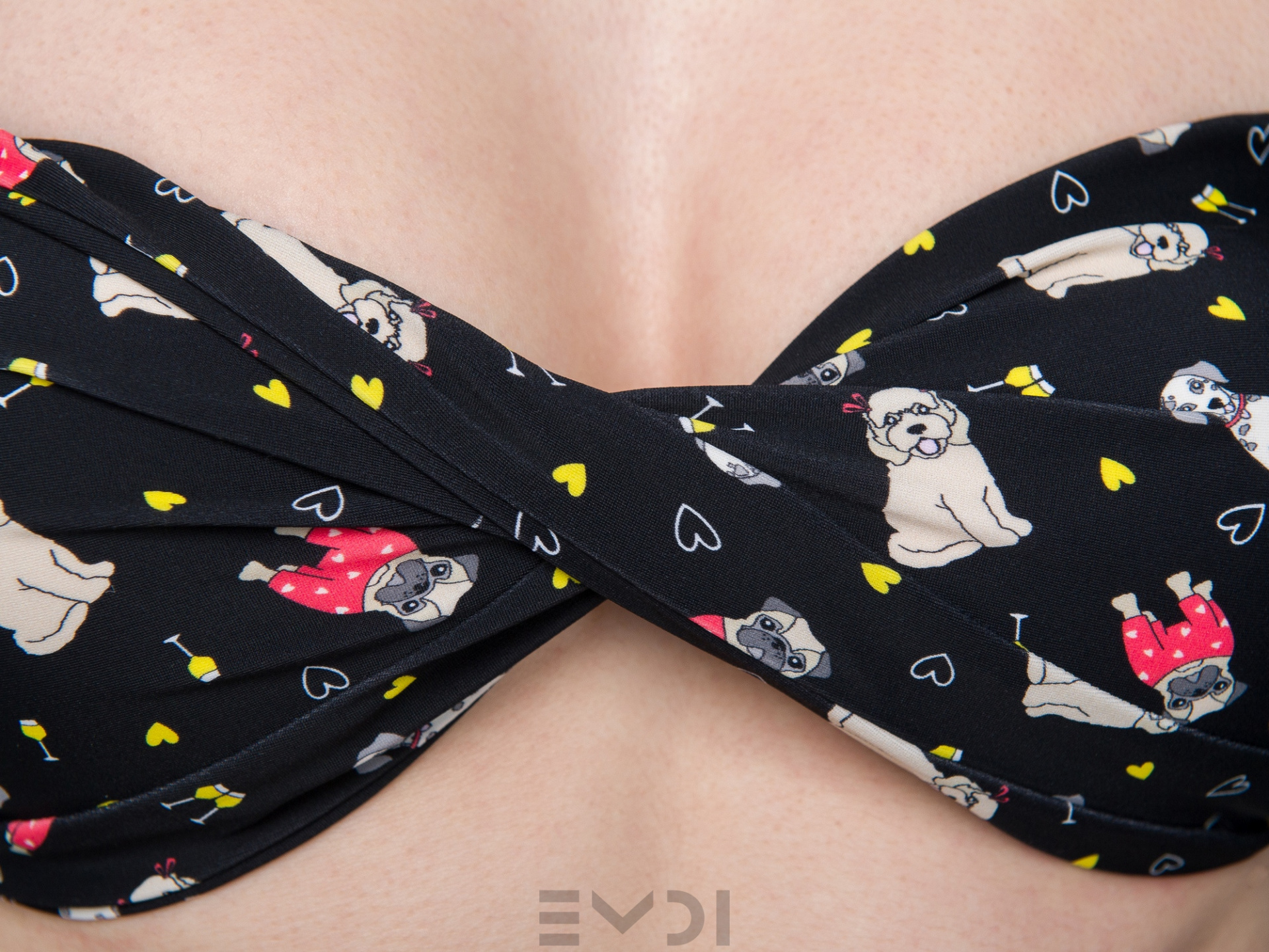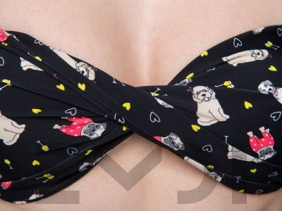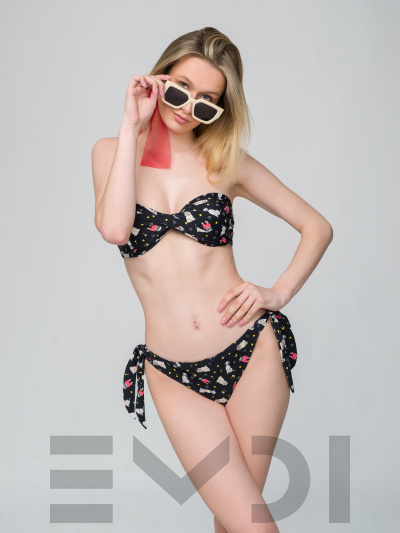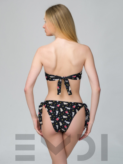 Купальник с лифом бандо. Лиф с вшитыми поролоновыми чашками, перекручен по центру. Сзади завязывается. Плавки низкие, сзади вырез танга, по бокам ширина регулируется завязками.Трусы дублированы подкладкой полностью.
