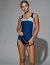 Яркий и стильный спортивный купальник с контрастными боковыми вставками. Спортивная форма спины плотно держит купальник во время занятий. Дублированный лиф.